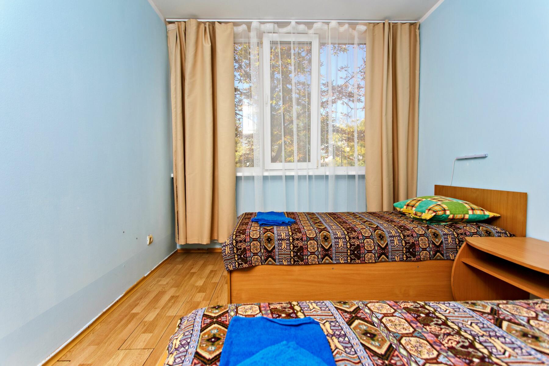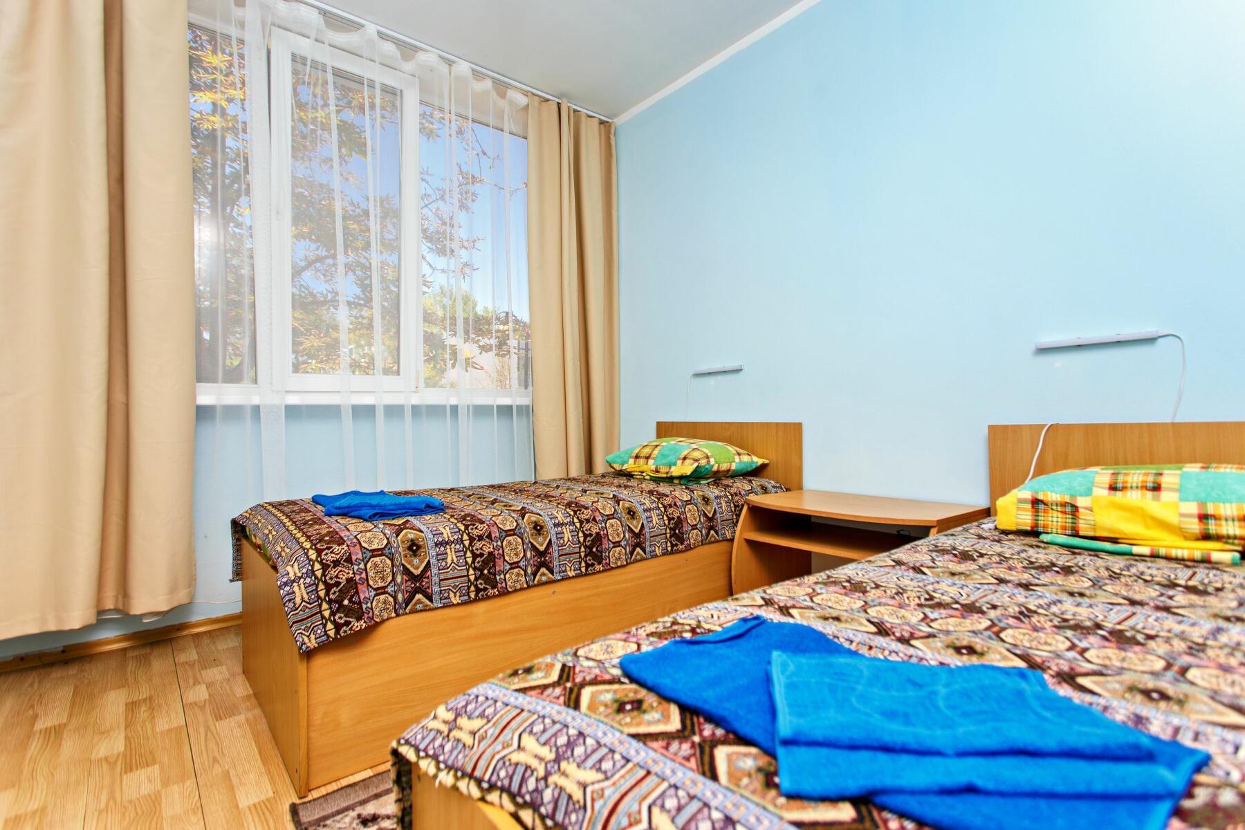 В номерах: современная мебель, кровати, шкафы, тумбочки, собственные санузлы с душем и умывальником. Ежедневная уборка для поддержания чистоты и порядка, регулярная смена белья и полотенец.