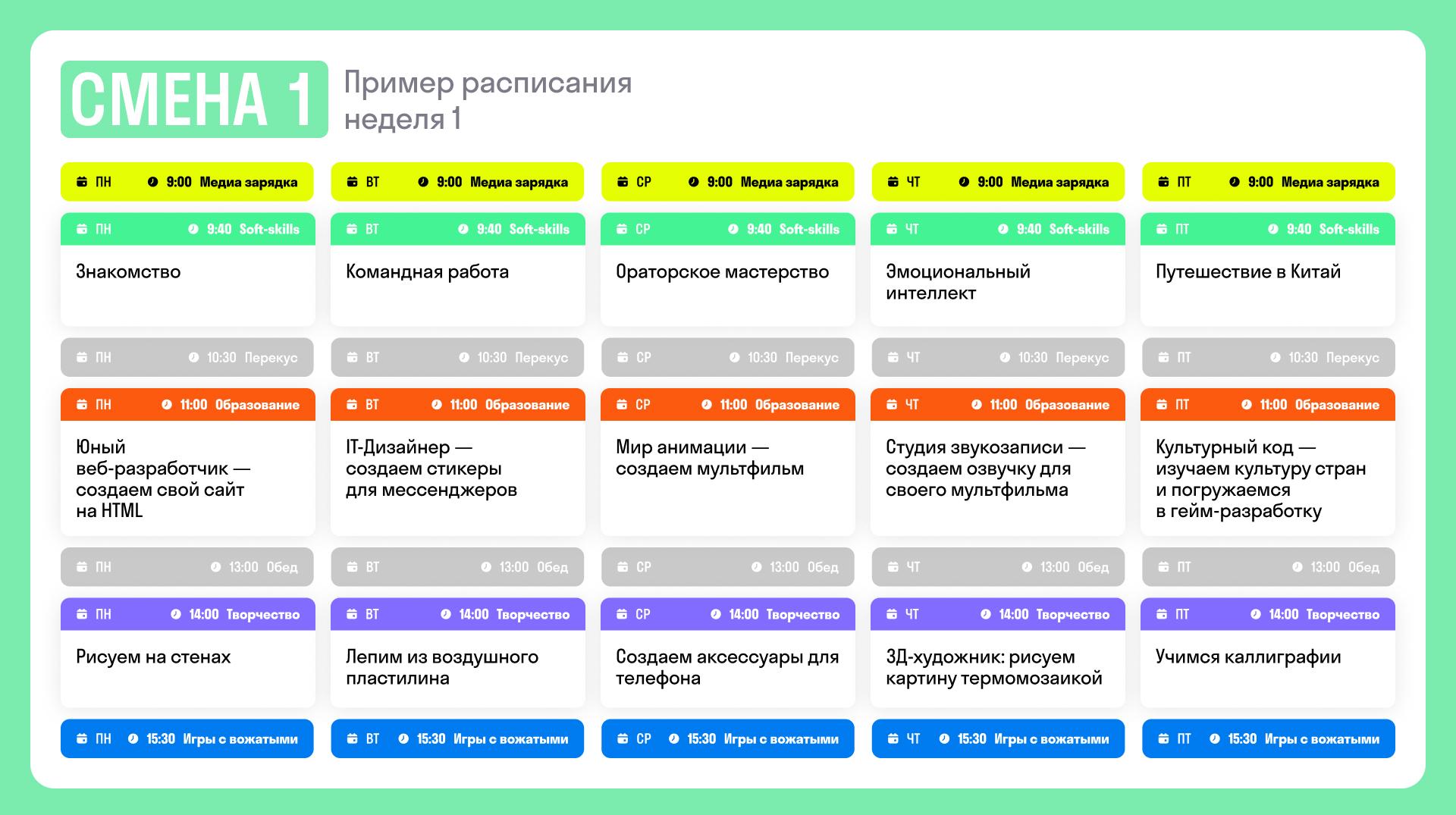 В рамках одной смены лагеря предусмотрено 2 формата: полный и неполный день. Купившие неполные день, занимаются с 09:00 до 13:00, купившие полный день, занимаются с 09:00 до 17:00. В каждой смене 10 занятий, которые проходят с понедельника по пятницу в течение 2 недель.