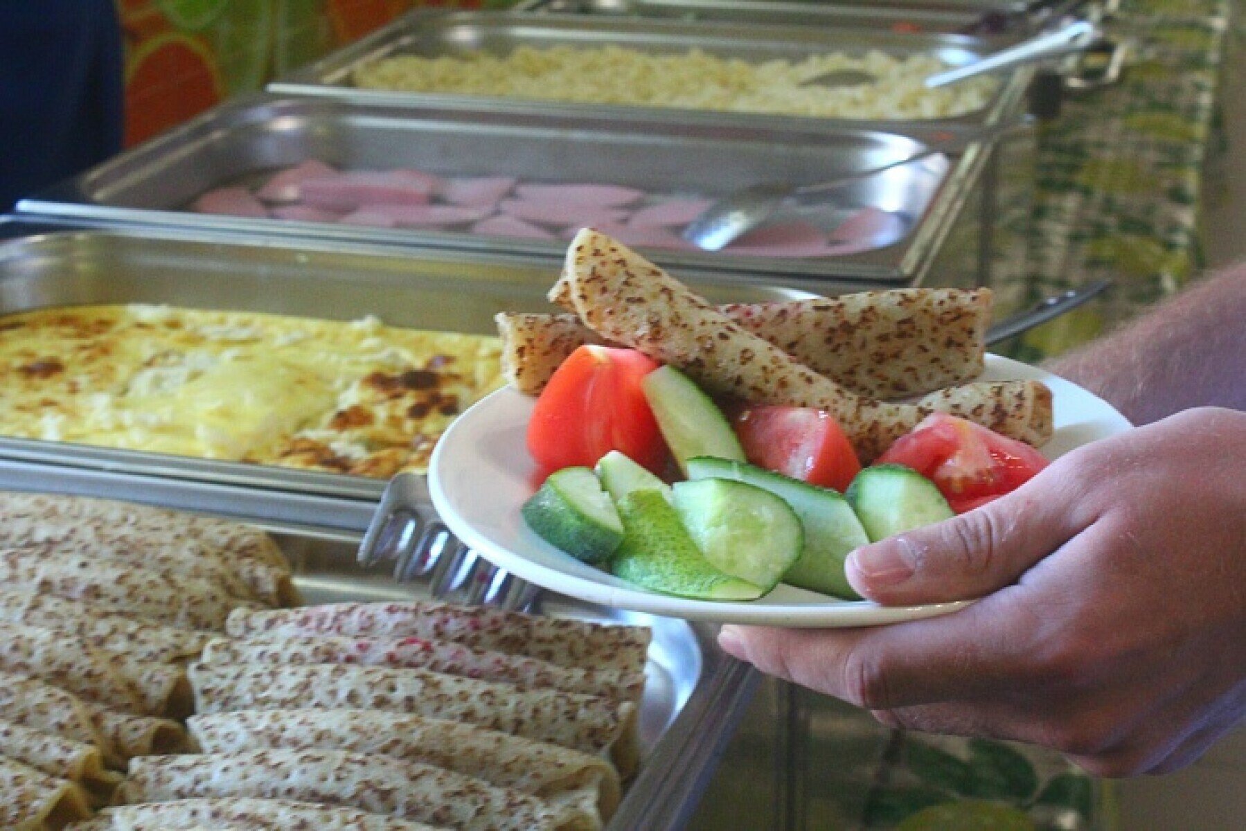 Пятиразовое питание (завтрак, обед, ужин – по системе «шведский стол», полдник, второй ужин - порционный) Питание осуществляется по меню, утверждаемому Роспотребнадзором. Шведский стол включает в себя выбор из двух блюд: салатов, супов, гарниров, мясных и рыбных блюд, напитков. Еды можно брать сколько захочешь. В корпусах установлены кулеры с питьевой водой.