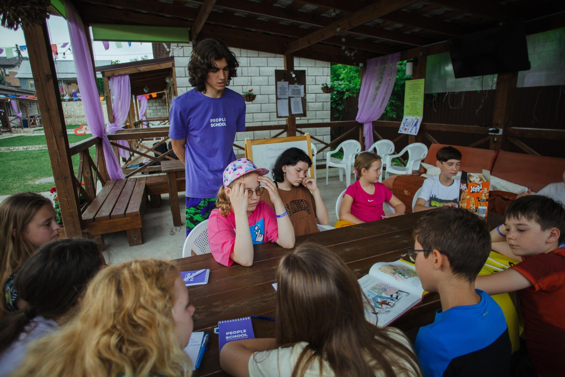Английская программа предоставляет ребятам возможность углубленного изучения английского языка. В начале смены каждый участник проходит тестирование, по результатам которого формируются группы. Занятия проходят в игровой форме. Программой предусмотрены 3 ч. английского ежедневно, а также увлекательные тематические дни — например, День блогера, День кино, День талантов, Бизнес-день и многое другое.