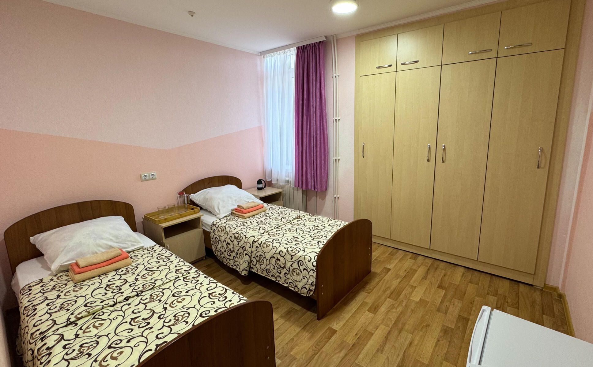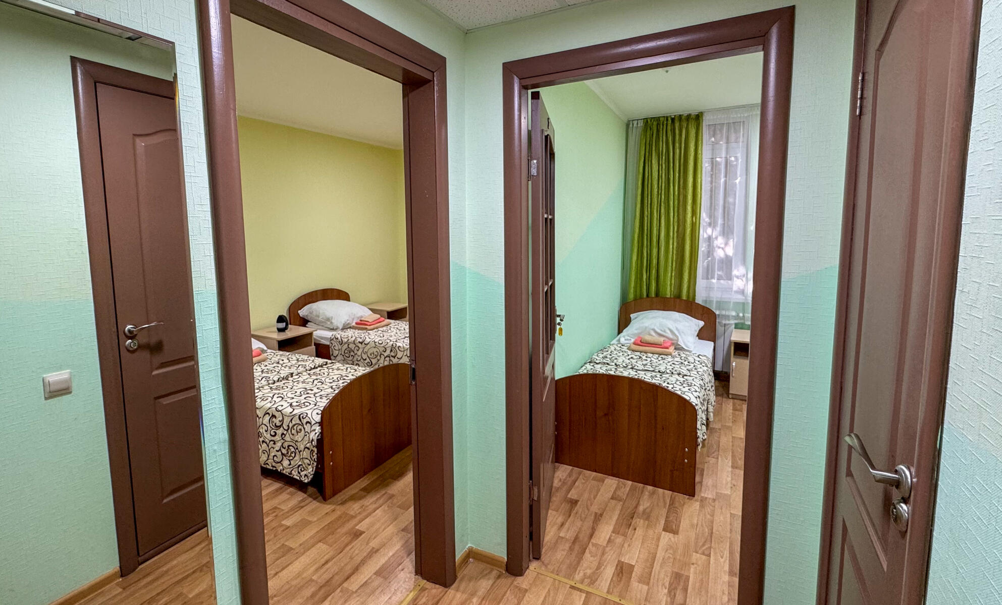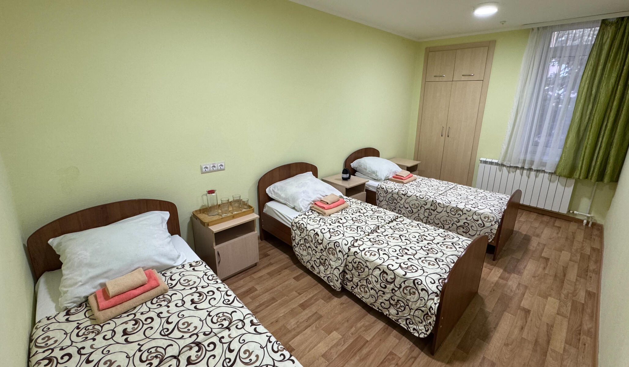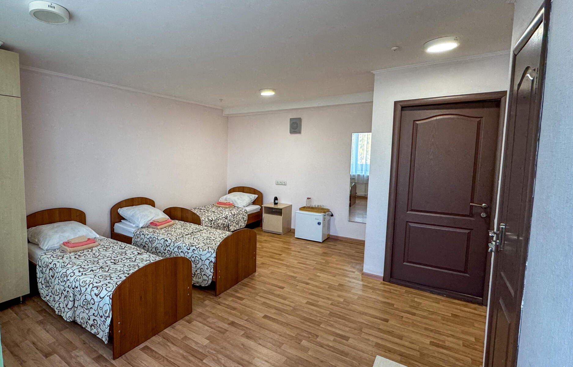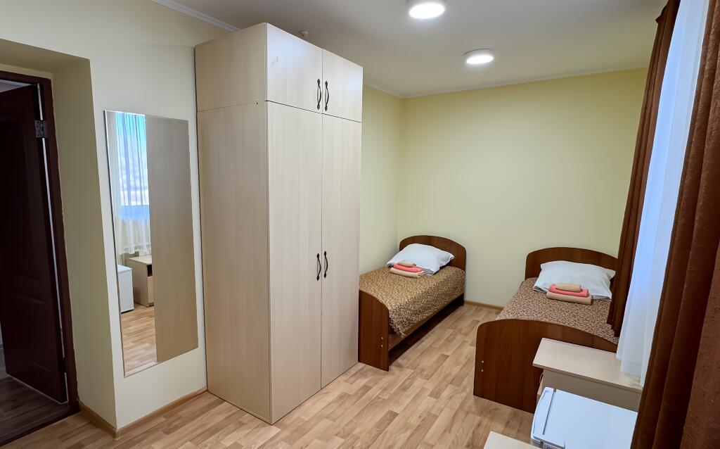 Комфортная обстановка: современная мебель, удобные кровати, вместительные шкафы, прикроватные тумбочки и сплит-системы для поддержания оптимальной температуры. Каждый номер оборудован собственным санузлом с душем и умывальником.