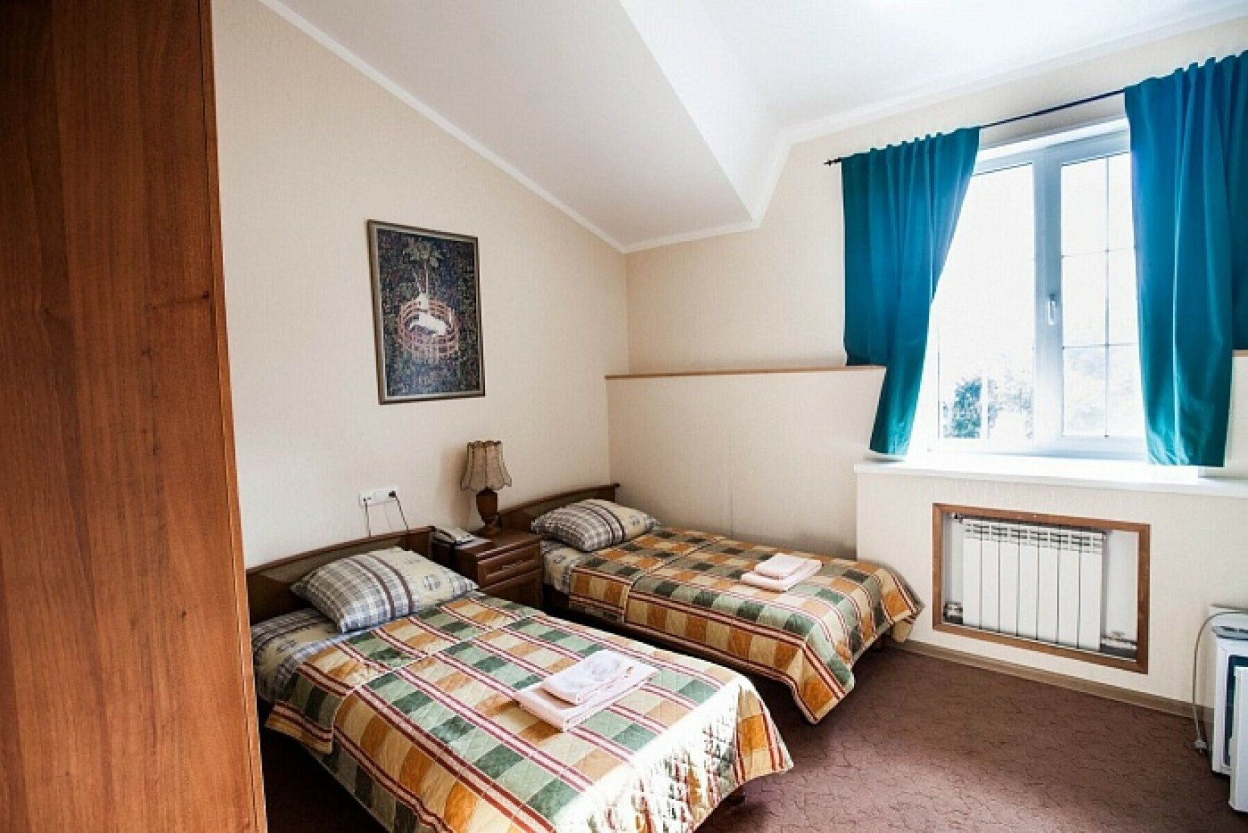 Размещение по 3-4 человека в комнате с одноместными кроватями.