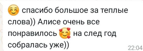 Спасибо большое всей команде от нашей семьи 💐Все было очень интересно, весело и задорно)Отдельное спасибо за питание, я думала она будет ходить голодная т.к. очень избирательная.Насте очень понравилось. Это не первый её выезд в лагерь, но впервые она забывала нам писать и звонить, очень увлеклась 😅